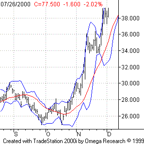 Par opposition, dans un marché en tendance, les indices fournis par les bandes reposent sur leur écartement. En effet, un écartement croissant des bandes suppose une hausse de l’écart-type, qui marque la formation d’une tendance forte. Dès lors, lorsque les bandes se rétrécissent, les variations de part et d’autre de la moyenne mobile se font plus faibles, ce qui suggère la fin d’une tendance. On peut dès lors passer à l’utilisation des bandes comme supports et résistances.