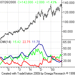 Enfin, l’ADX permet, associé au moyennes mobiles, de déterminer la validité de ces dernières. En effet, les moyennes mobiles donnant parfois de faux signaux, il est possible de se positionner uniquement lorsque l’ADX indique une tendance, et de suivre alors les signaux des moyennes mobiles.
