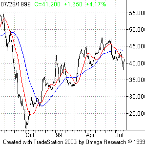 Réciproquement, un signal de vente se manifeste dès lors qu’une moyenne mobile coupe à la baisse (i.e. en venant du haut) une moyenne mobile de plus long terme et se trouve ainsi en dessous.