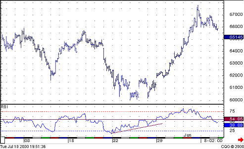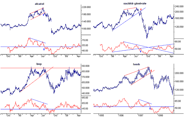 Le principe des divergences est également applicable au RSI, et ce de manière plus aisée que sur le MACD, dans la mesure où des zones de survente et de surachat peuvent être légitimement établies.