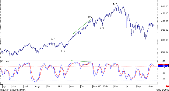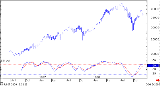 Les stochastiques sont utilisables à de nombreux titres. Tout d’abord, la présence du stochastique rapide sur des extrêmes (près de 0 ou 100) indique des situations de survente ou de surachat. Néanmoins, en dépit du lissage qu’opère %D sur %K, cet indicateur demeure volatil, ce qui le rend difficilement utilisable dans ce contexte. Toutefois, réciproquement, cette forte volatilité permet de considérer que, si %D se maintient longuement à des niveaux élevés (resp. bas), les cours suivent une tendance fortement haussière (resp. baissière).
